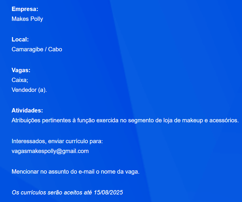 2 Vagas de Emprego para Caixa e Vendedor(a) sem experiência na empresa Makes Polly em Recife e região nesta quarta (13/08/2025)