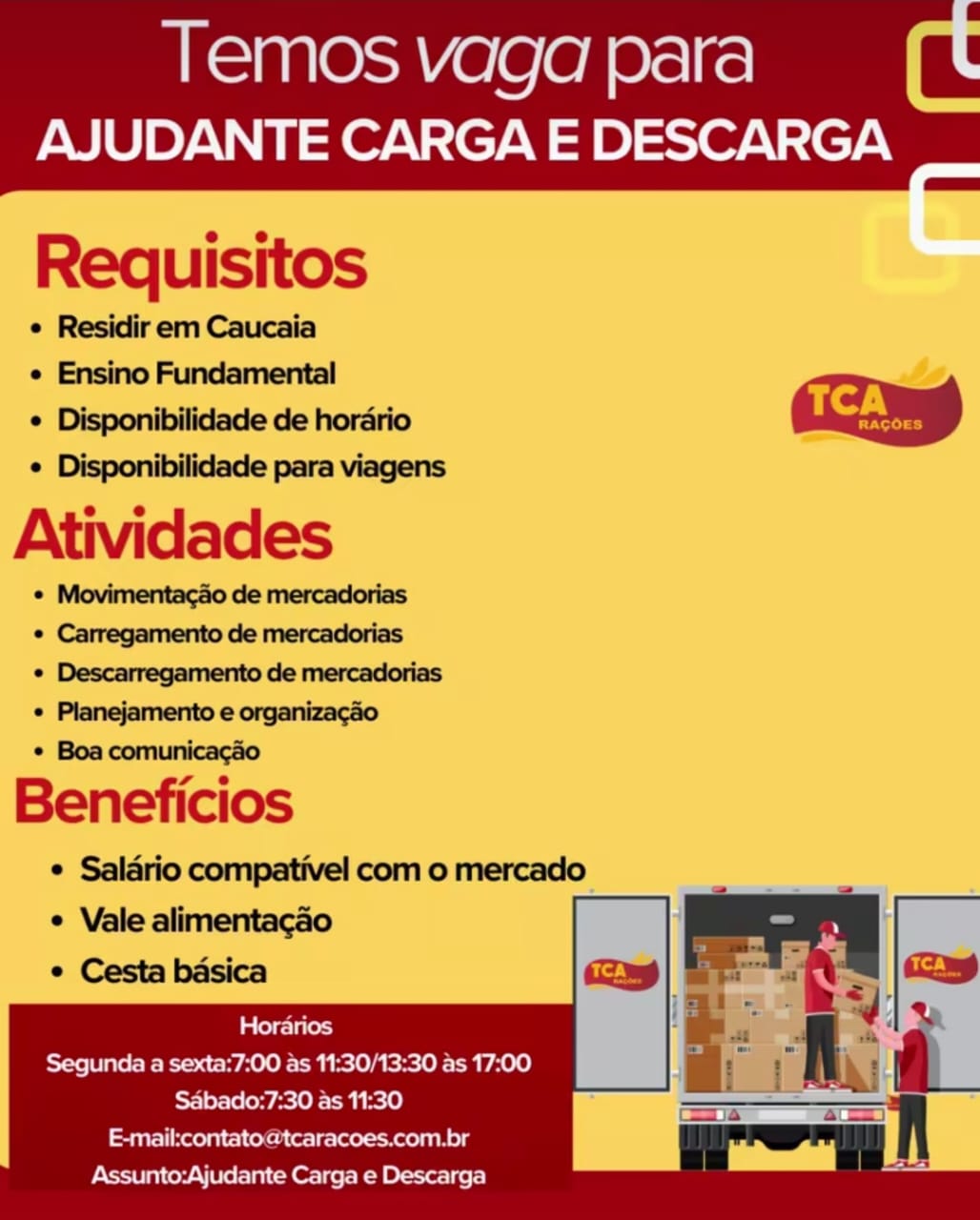 Vaga de emprego para Ajudante de Carga e Descarga no setor de rações TCA Rações em Fortaleza e região neste sábado (16/08)