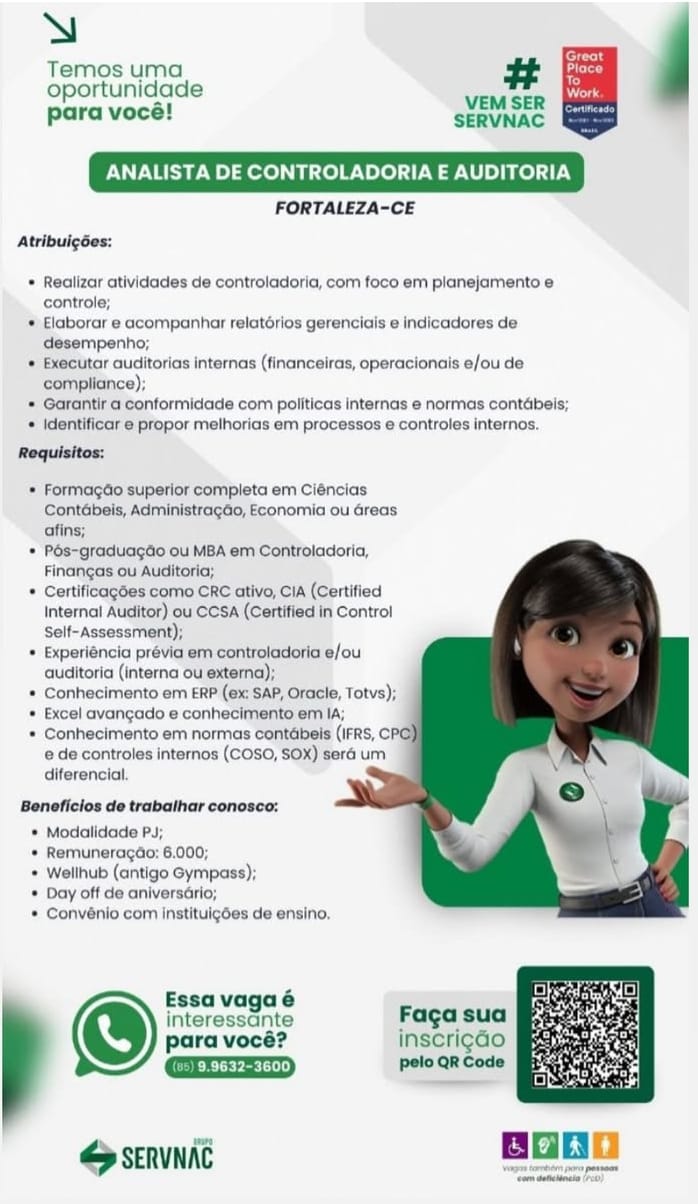 Vaga de emprego para Analista de Controladoria e Auditoria na empresa Servnac em Fortaleza e região nesta quarta (13/08)