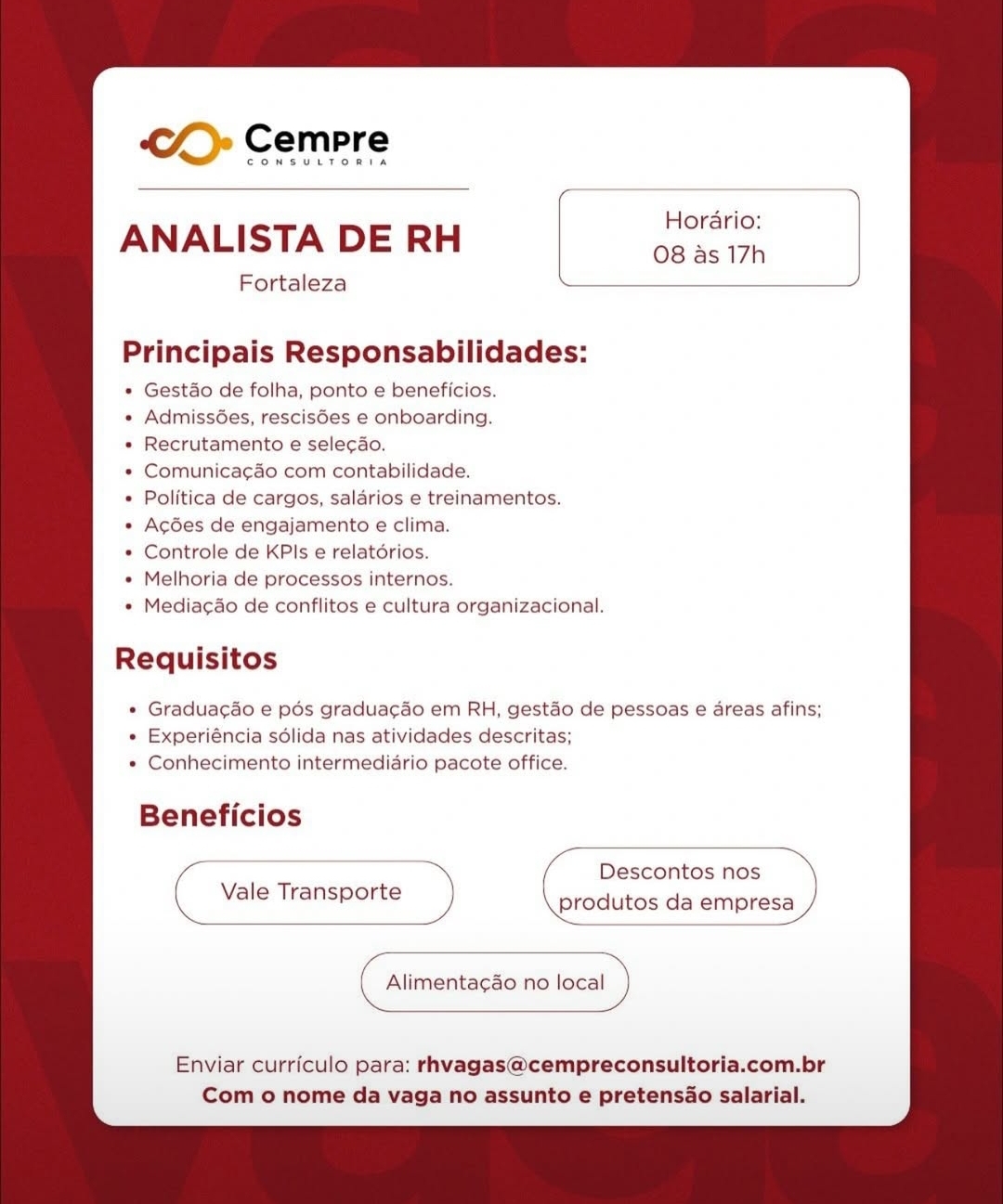 As informações sobre a vaga de emprego, como salário, remuneração, benefícios, requisitos, local de trabalho e forma de candidatura (e-mail ou whatsapp para enviar seu currículo) estarão na imagem abaixo, caso estejam disponíveis.👇