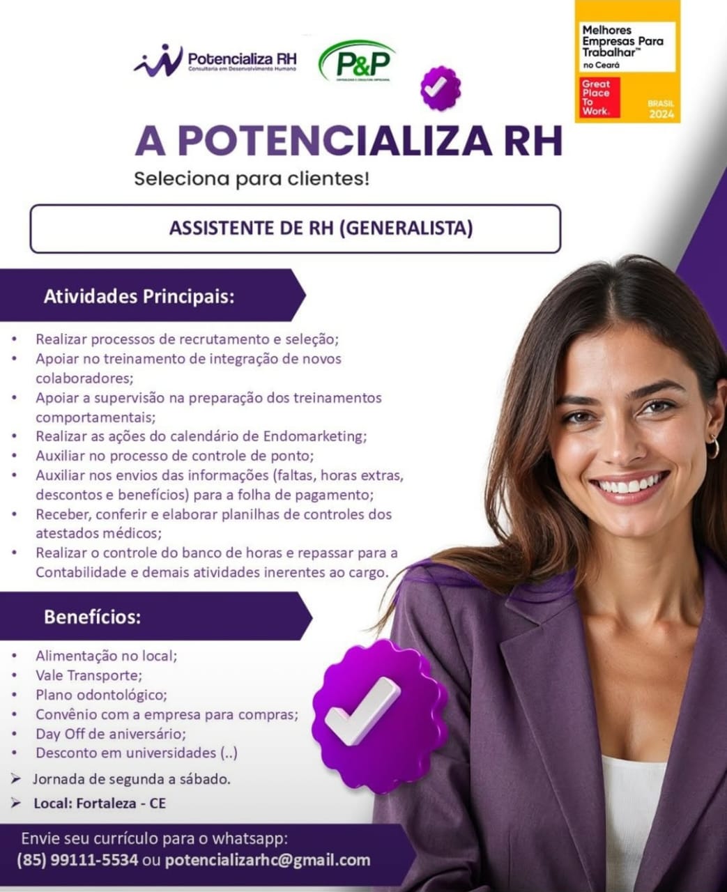 Vaga de emprego para Assistente de RH (Generalista) na consultoria Potencializa RH em Fortaleza e região nesta quarta (13/08)