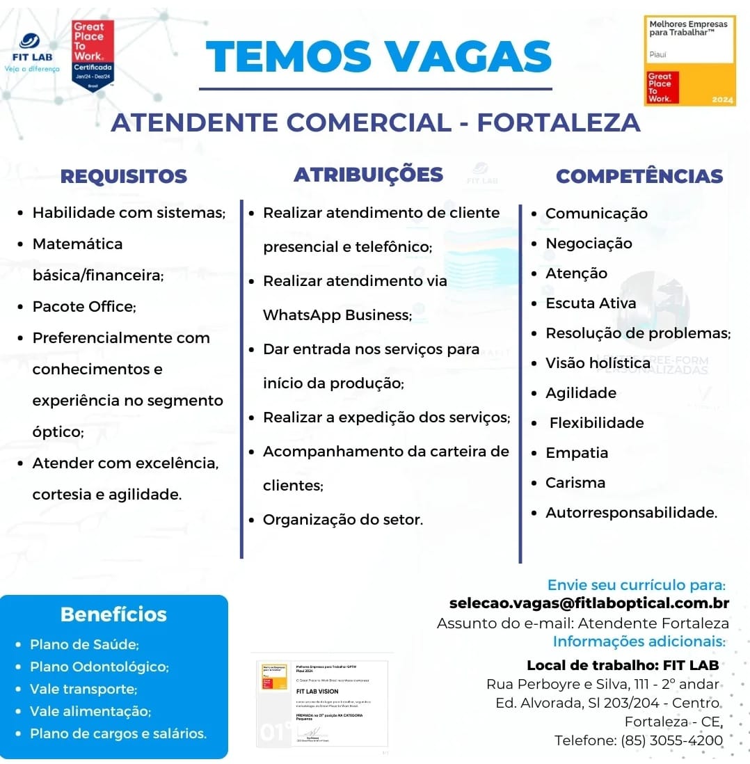 Vaga de emprego para Atendente Comercial no setor óptico Fit Lab Vision em Fortaleza e região neste sábado (16/08)