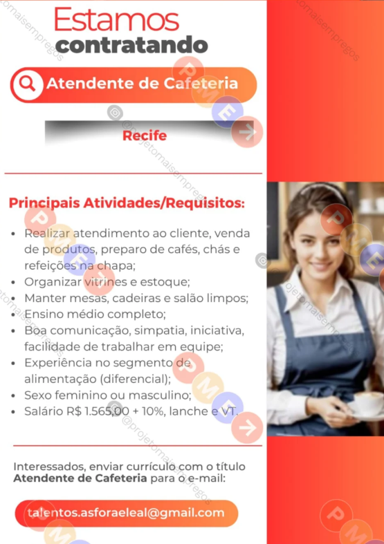 Vaga de Emprego para Atendente de Cafeteria sem experiência no segmento alimentício em Recife e região nesta quinta (14/08/2025)