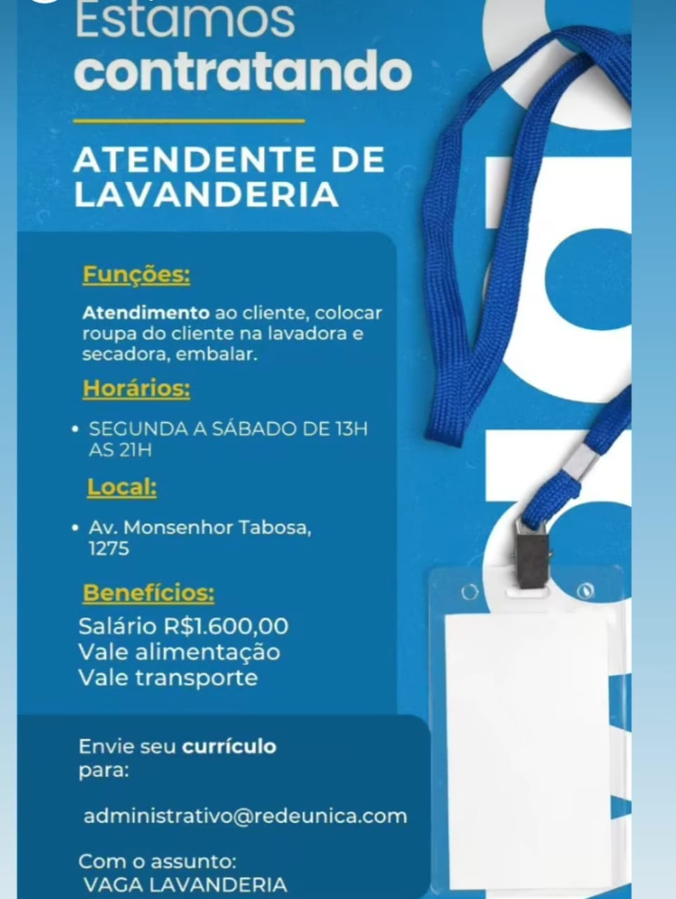 Vaga de emprego para Atendente de Lavanderia na empresa Rede Única em Fortaleza e região nesta quarta (13/08)