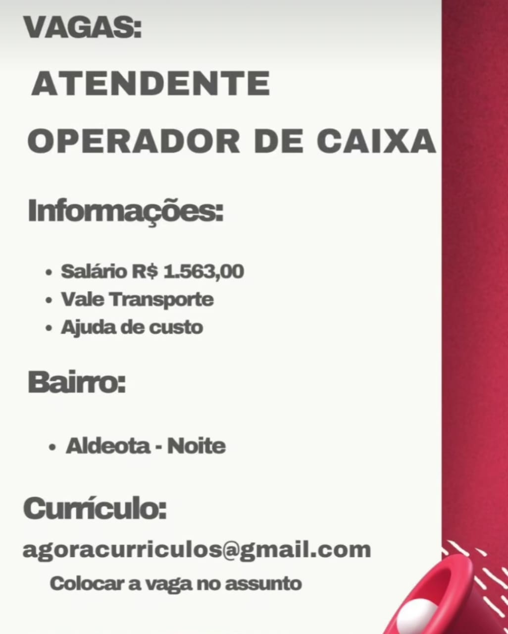 As informações sobre a oportunidade de trabalho, como salário, remuneração, benefícios, requisitos, local de trabalho e forma de candidatura (e-mail ou whatsapp para enviar seu currículo) estarão na imagem acima, caso estejam disponíveis.