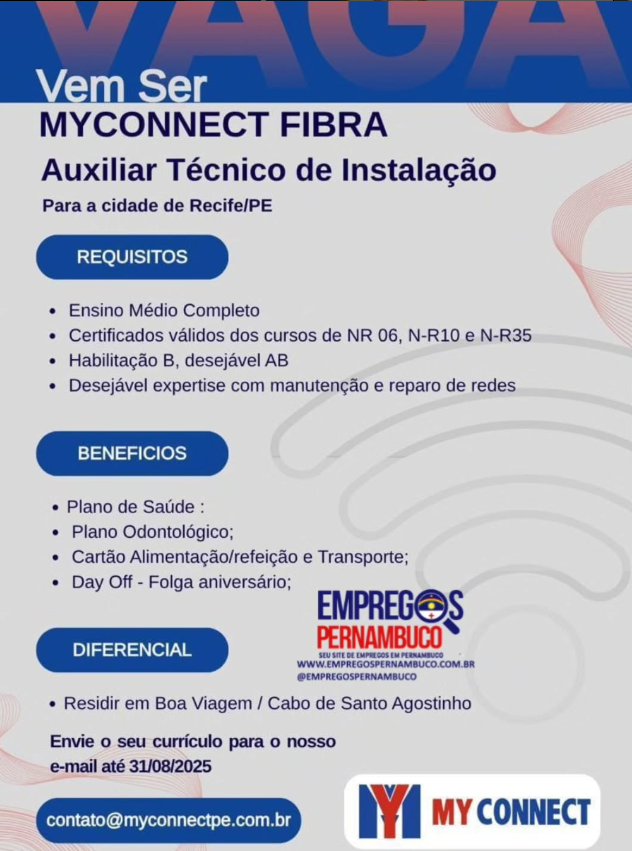 Vaga de Emprego para Auxiliar Técnico de Instalação sem experiência na empresa My Connect Fibra em Recife e região nesta quarta (13/08/2025)