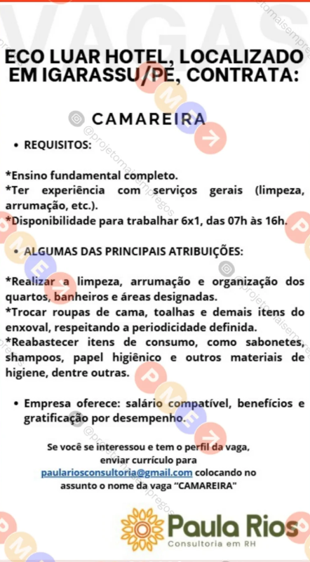 Vaga de Emprego para Camareira na empresa Paula Rios Consultoria de RH em Recife e região nesta quinta (14/08/2025)
