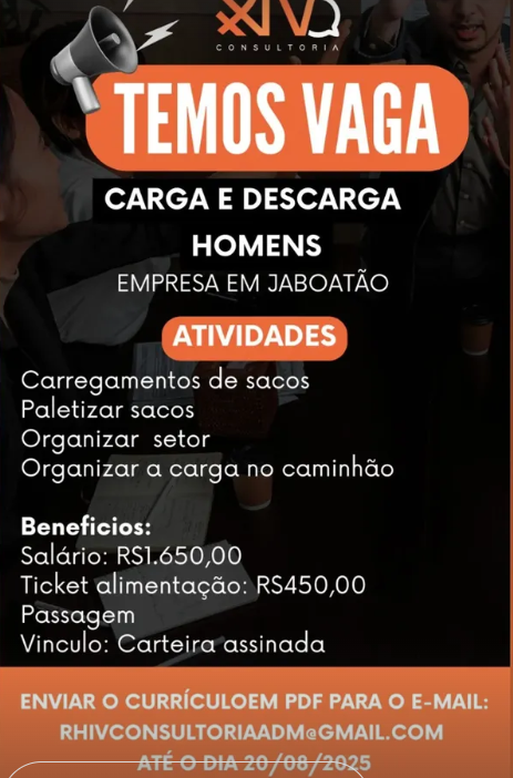 Vaga de Emprego para Carga e Descarga sem experiência na empresa RH IV Consultoria em Recife e região nesta quarta (13/08/2025)