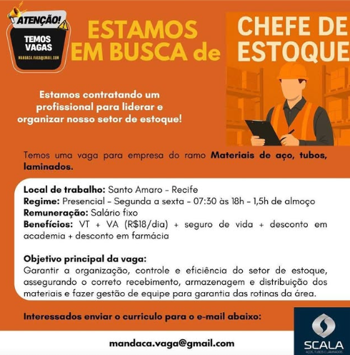 Vaga de Emprego para Chefe de Estoque sem experiência na Scala Aços, Tubos e Laminados em Recife e região nesta quarta (13/08/2025)