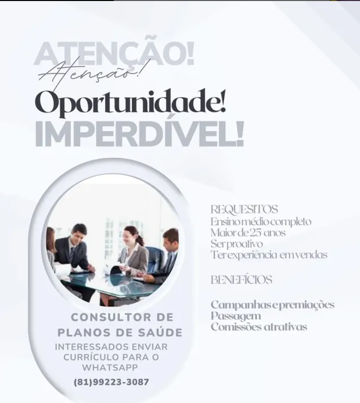 Vaga de Emprego para Consultor de Planos de Saúde em empresa na região de Recife nesta quarta (13/08/2025)