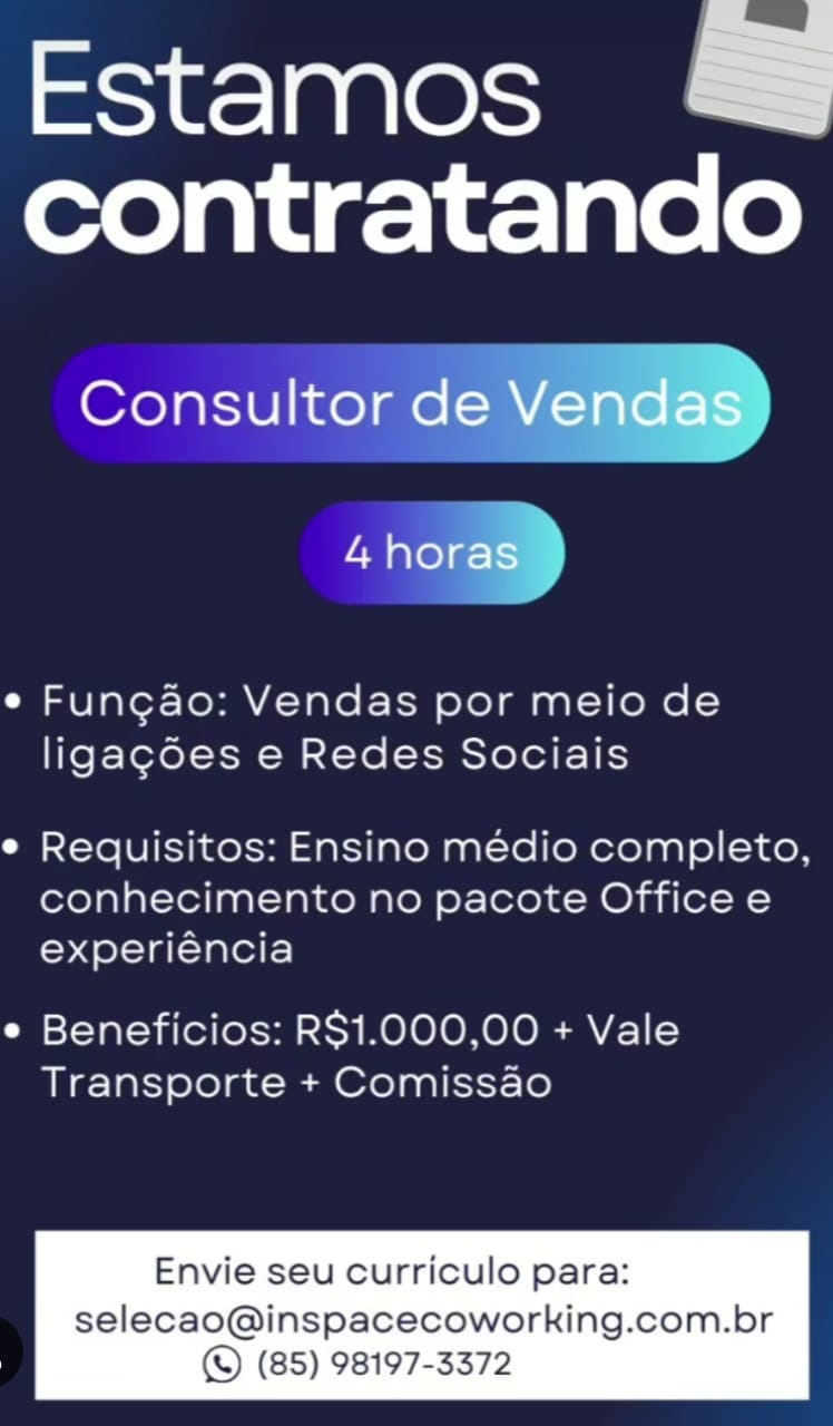 Vaga de emprego para Consultor de Vendas na empresa Inspace Coworking em Fortaleza e região nesta quarta (13/08)