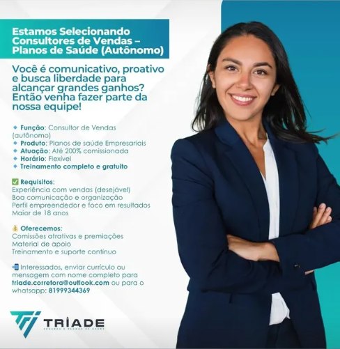 Vaga de Emprego para Consultor de Vendas sem experiência na Tríade Seguros e Planos de Saúde em Recife e região nesta quarta (13/08/2025)
