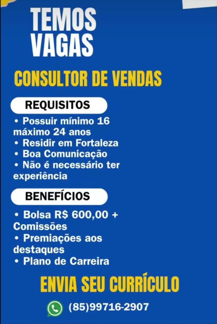 Vaga de emprego para Consultor de Vendas SEM experiência no setor comercial em Fortaleza e região nesta quarta (20/08)