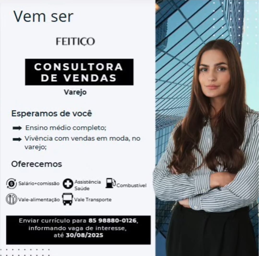 Vaga de emprego para Consultora de Vendas no setor de moda Feitiço em Fortaleza e região neste sábado (16/08)