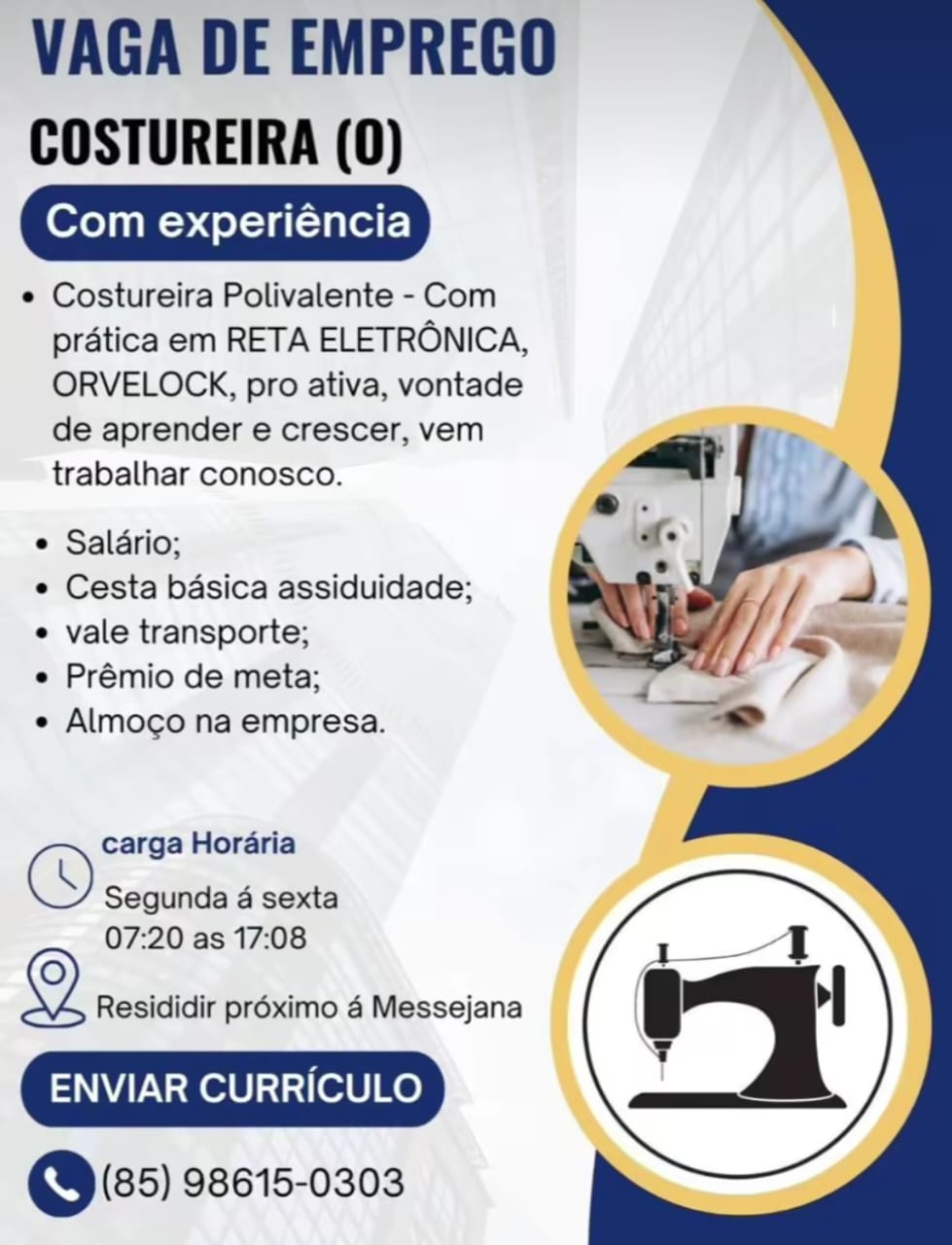 Vaga de emprego para Costureira(o) na empresa de confecção em Fortaleza e região nesta quarta (13/08)
