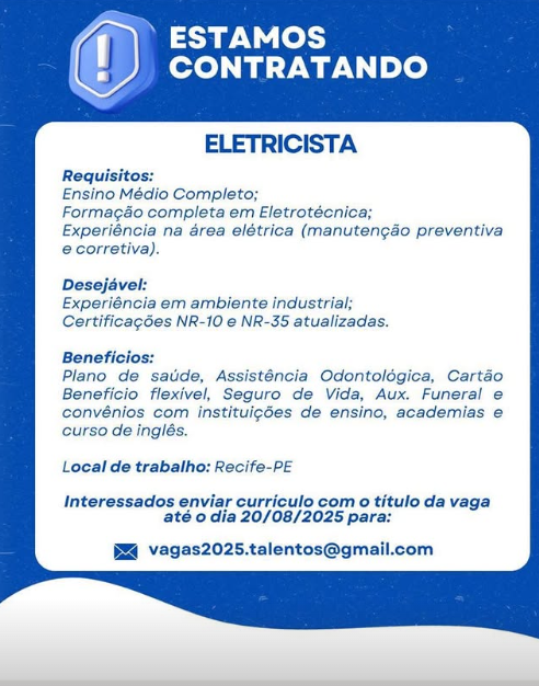 Vaga de Emprego para Eletricista em empresa na região de Recife nesta quarta (13/08/2025)