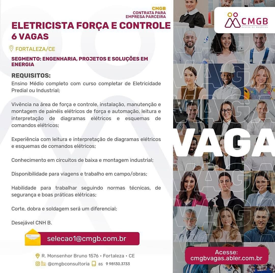 Vaga de emprego para Eletricista força e controle no setor de engenharia, projetos e soluções em Fortaleza e região nesta quinta (14/08)
