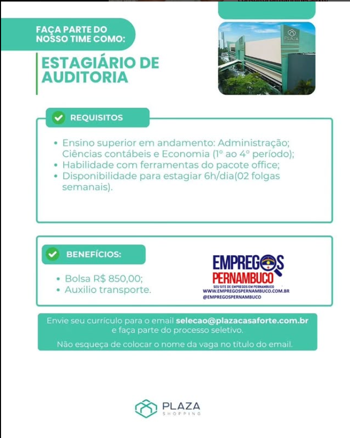 Vaga de Emprego para Estagiário de Auditoria no Plaza Shopping em Recife e região nesta quarta (13/08/2025)