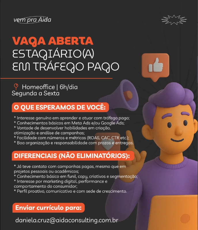 Vaga de Emprego para Estagiário de Tráfego Pago sem experiência na empresa Aida Consulting em Recife e região nesta quarta (13/08/2025)