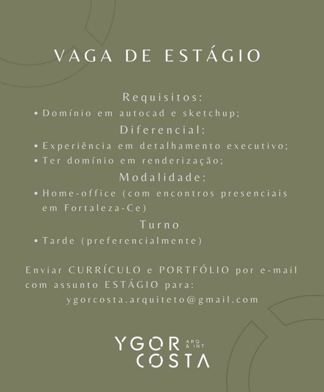 Vaga de emprego para Estagiário no setor de arquitetura Ygor Costa Arq e Int em Fortaleza e região neste sábado (16/08)
