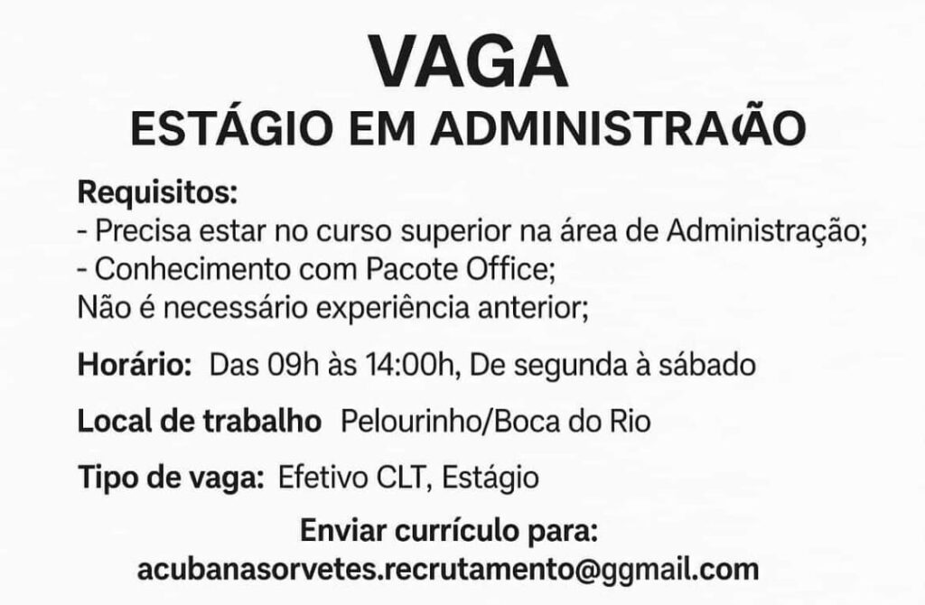 As informações sobre a oportunidade de trabalho, como salário, remuneração, benefícios, requisitos, local de trabalho e forma de candidatura (e-mail ou whatsapp para enviar seu currículo) estarão na imagem acima, caso estejam disponíveis.