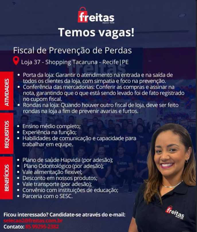 Vaga de Emprego para Fiscal de Prevenção de Perdas na empresa Freitas em Recife e região nesta quarta (13/08/2025)