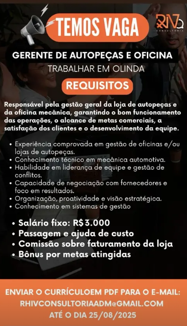 Vaga de Emprego para Gerente de Autopeças e Oficina na empresa RH IV Consultoria em Recife e região nesta quarta (13/08/2025)