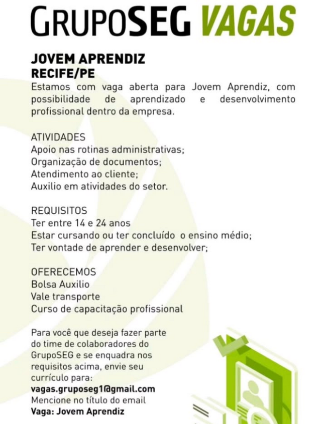 Vaga de Emprego para Jovem Aprendiz sem experiência na empresa Grupo Seg em Recife e região nesta quarta (13/08/2025)