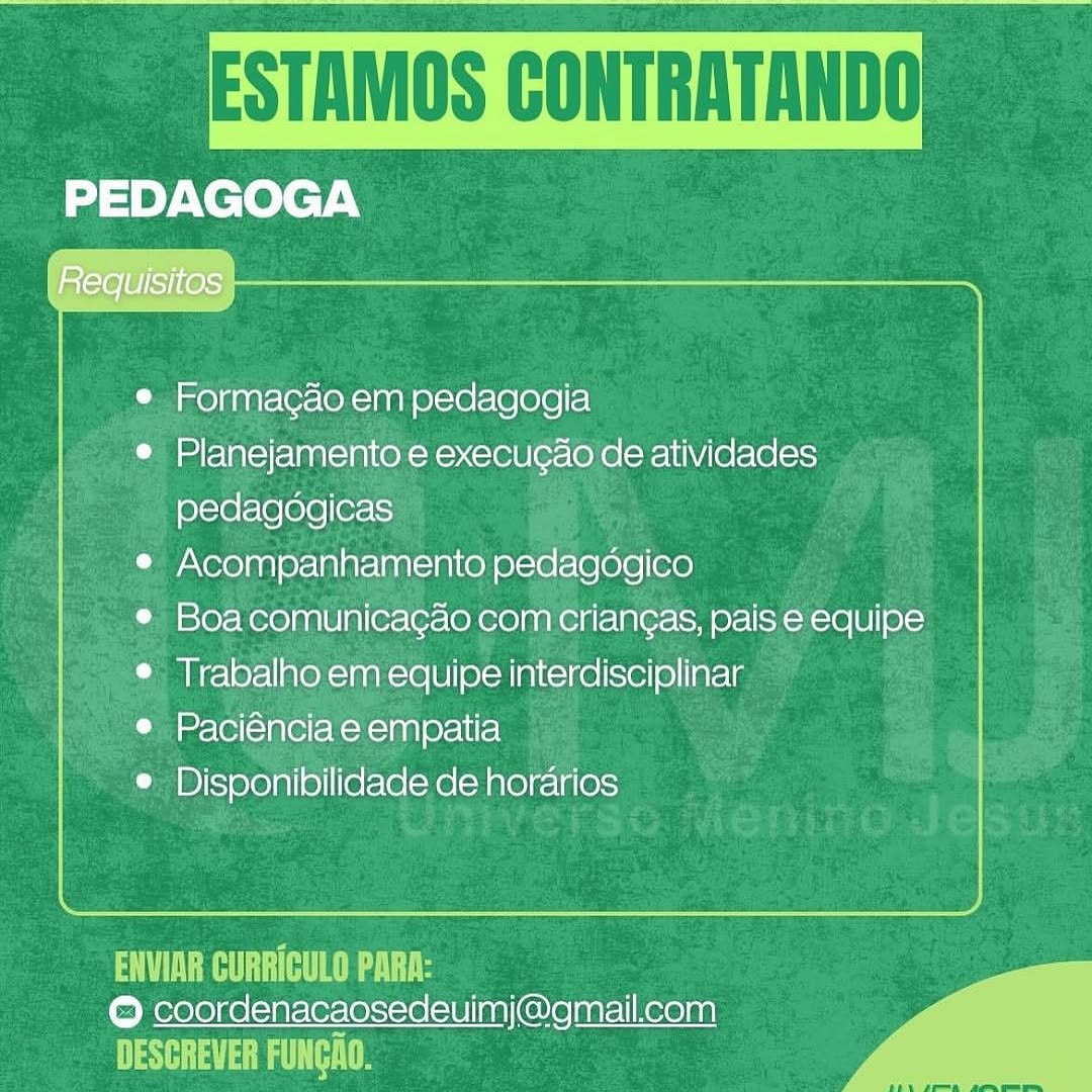 Vaga de emprego para Pedagoga no setor educacional Universo Menino Jesus em Fortaleza e região neste sábado (16/08)