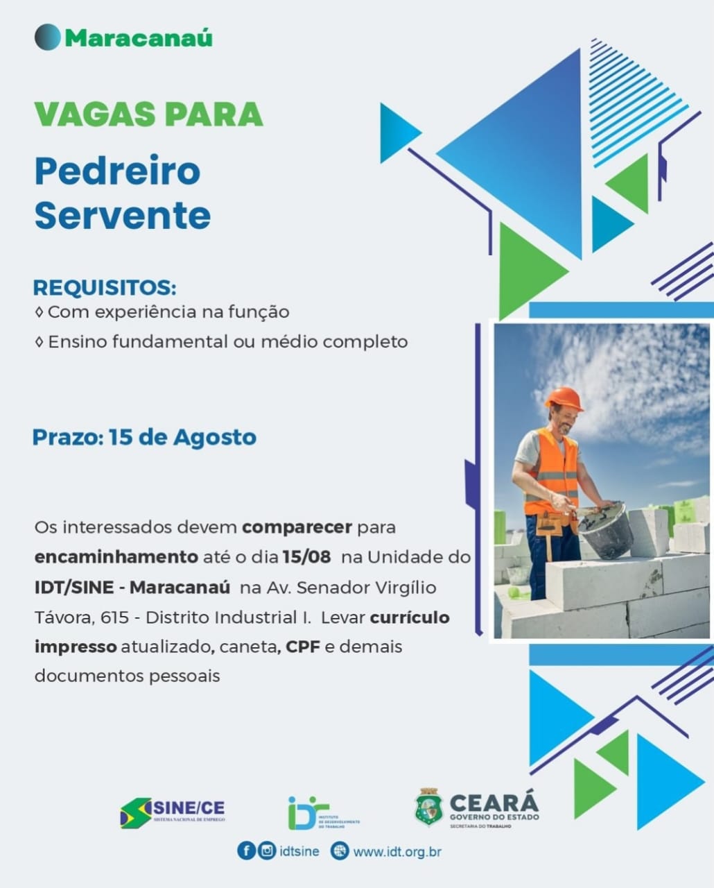 Vaga de emprego para Pedreiro Servente no Sine/CE em Fortaleza e região nesta quarta (13/08)