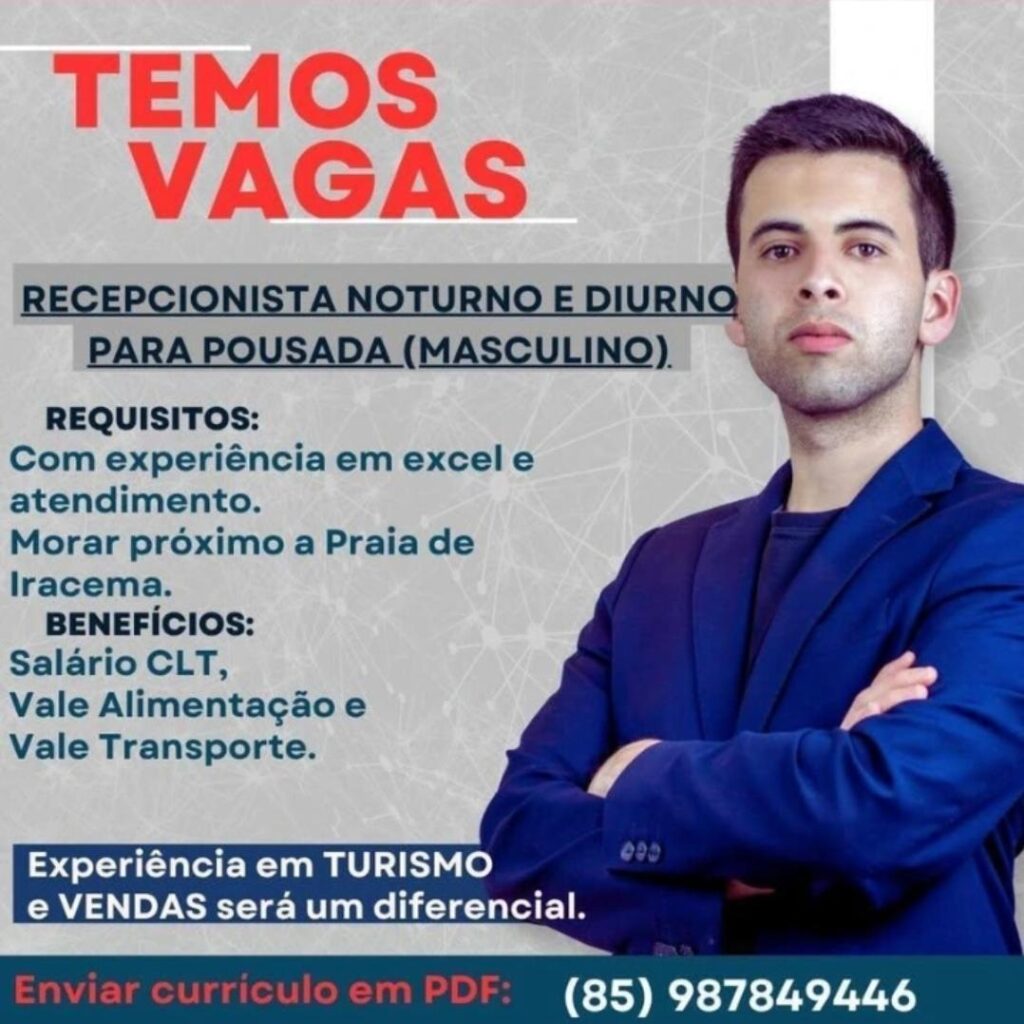 Vaga de emprego para Recepcionista Noturno e Diurno na pousada em Fortaleza e Região neste sábado e domingo (09/08 e 10/08)
