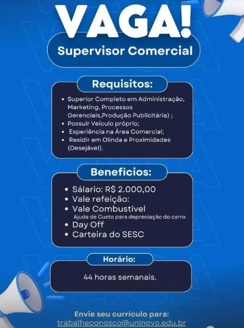 Vaga de Emprego para Supervisor Comercial na empresa Uni Novo em Recife e região nesta quarta (13/08/2025)
