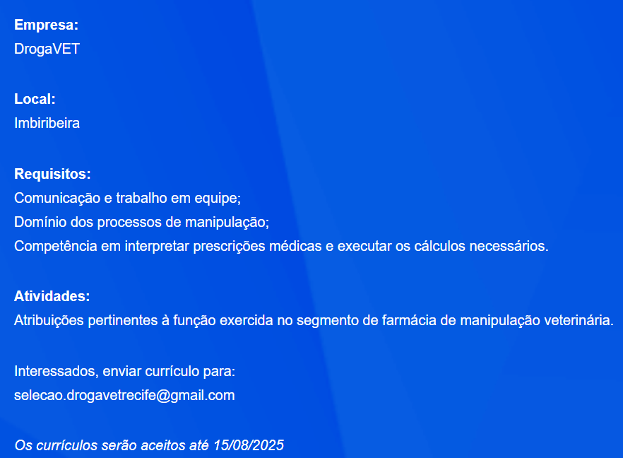 Vaga de Emprego para Técnico de Manipulação sem experiência na farmácia veterinária Droga VET em Recife e região nesta quarta (13/08/2025)