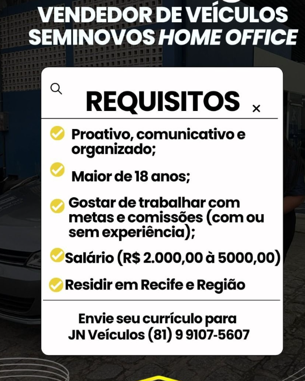 Vaga de Emprego para Vendedor Home Office sem experiência na IN Veículos Novos e Seminovos em Recife e região nesta quarta (13/08/2025)