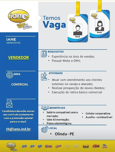 Vaga de Emprego para Vendedor na empresa Iane em Recife e região nesta quarta (13/08/2025)