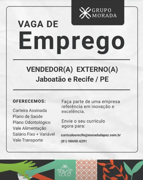 Vaga de Emprego para Vendedor(a) Externo(a) sem experiência na empresa Grupo Morada em Recife e região nesta quarta (13/08/2025)