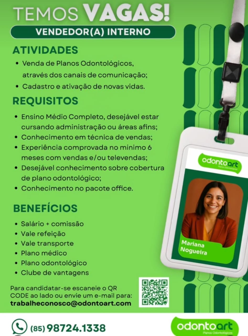 Vaga de emprego para Vendedor(a) Interno na empresa de planos odontológicos Odontoart em Fortaleza e região nesta quarta (13/08)