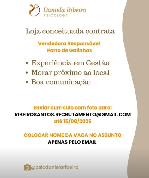 Vaga de Emprego para Vendedora no segmento de comércio em Recife e região nesta quarta (13/08/2025)