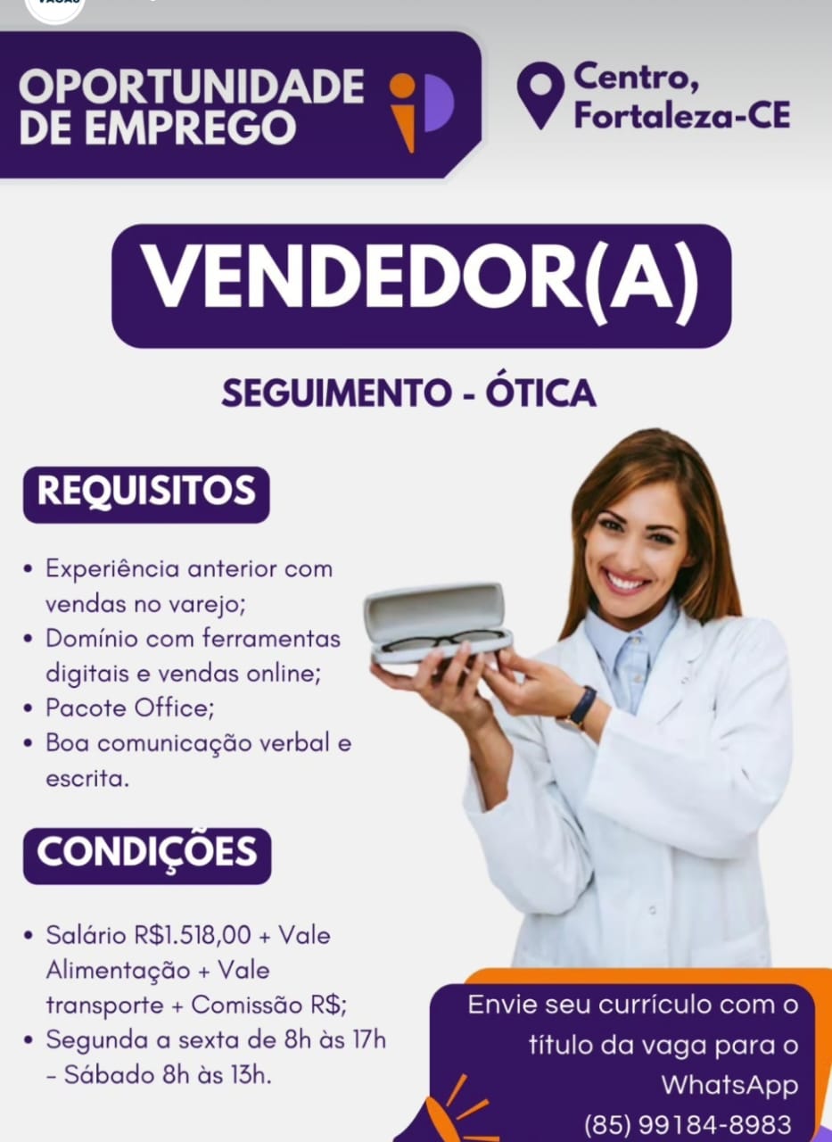 Vaga de emprego para Vendedor(a) no segmento ótico em Fortaleza e região nesta quarta (13/08)