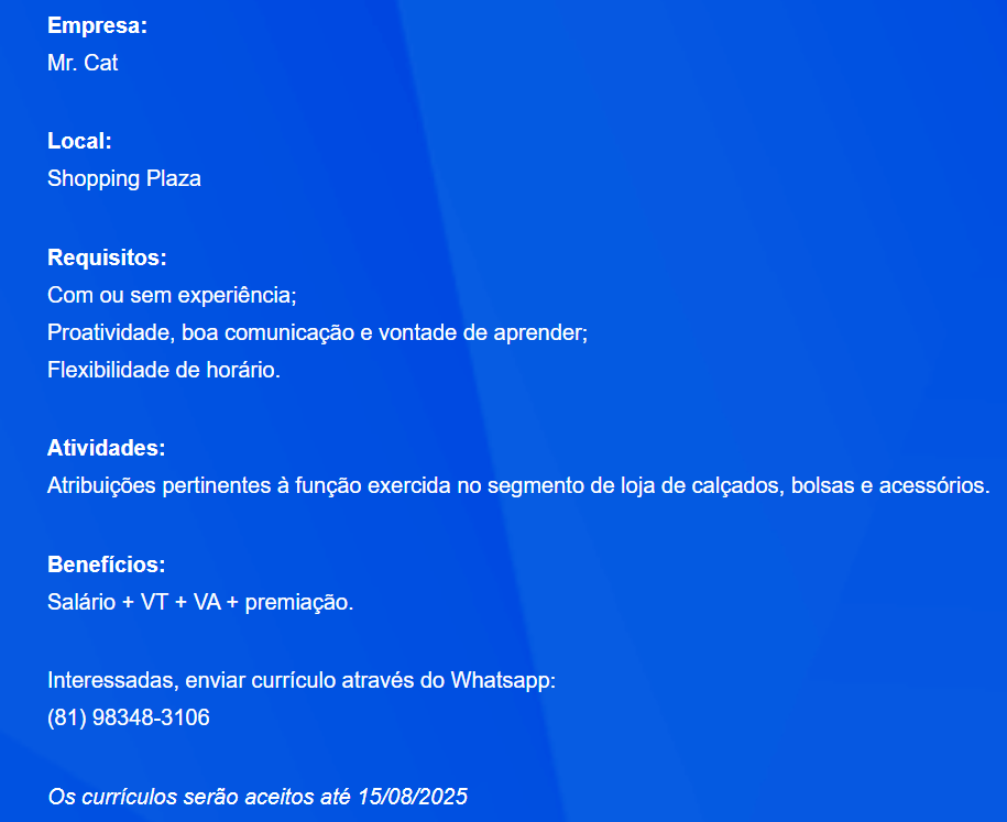 Vaga de Emprego para Vendedor(a) sem experiência na loja Mr. Cat em Recife e região nesta quarta (13/08/2025)