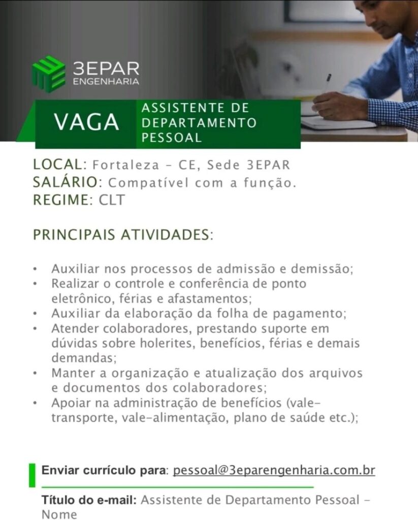 Vaga para Assistente de departamento pessoal na 3EPAR Engenharia em Fortaleza e Região nesta quarta feira (23/07)