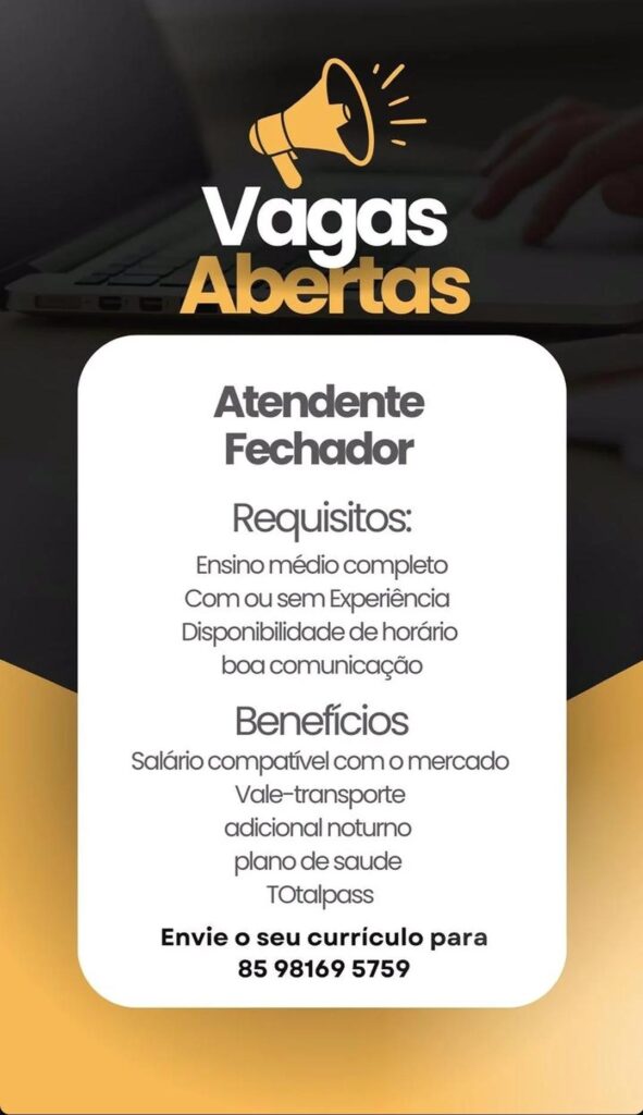 Vaga para Atendente Fechador em Fortaleza e Região nesta quarta feira (23/07)