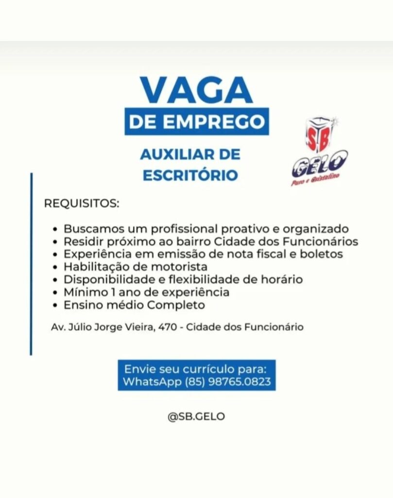 Vaga para Auxiliar de escritório no SB Gelo em Fortaleza e Região nesta terça feira (22/07)