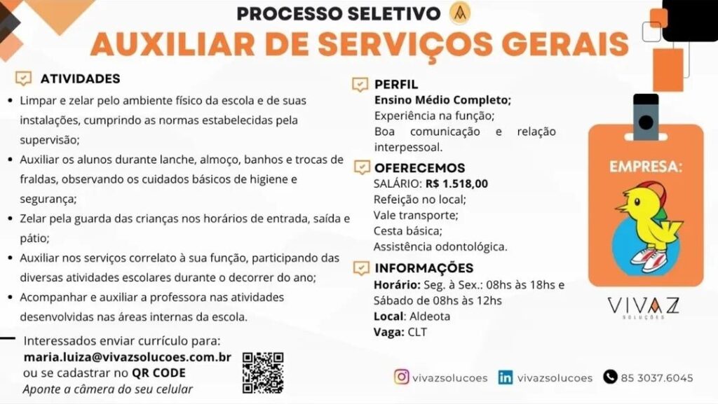 Vaga para Auxiliar de Serviços Gerais no Vivaz Soluções em Fortaleza e Região nesta quarta feira (16/07)