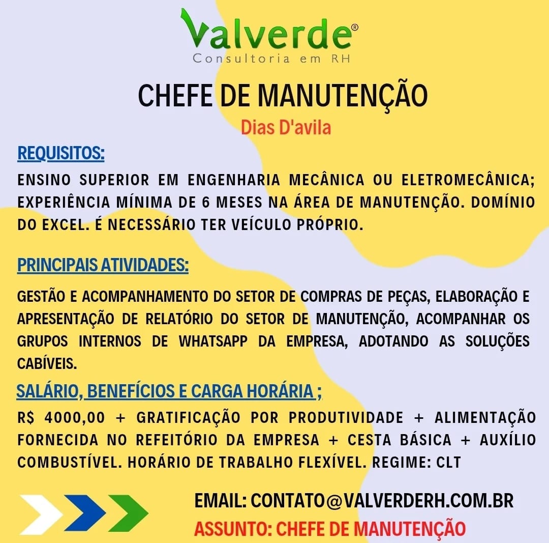 Vaga para Chefe de Manutenção na Consultoria Valverde RH em Salvador e região nesta quinta (24/07)