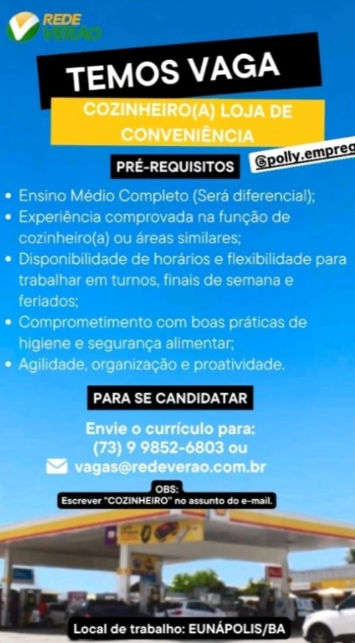 Vaga de emprego para Cozinheira em Loja de Conveniência do Posto Verão em Salvador e região nesta segunda (04/08)