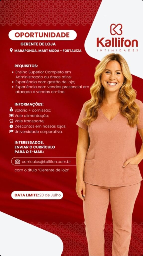 Vaga para Gerente de Loja na Kallifon Intimidades em Fortaleza e Região nesta quarta feira (16/07)