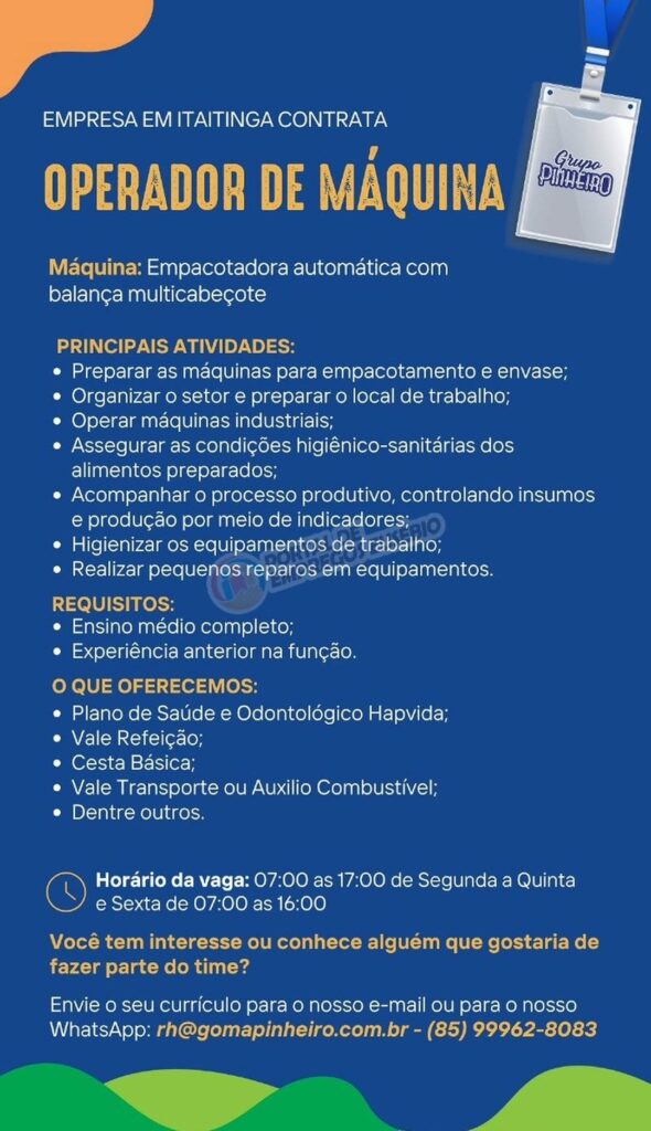 Vaga para Operador de Máquina no Grupo Pinheiro em Itaitinga e Região nesta quinta feira (24/07)