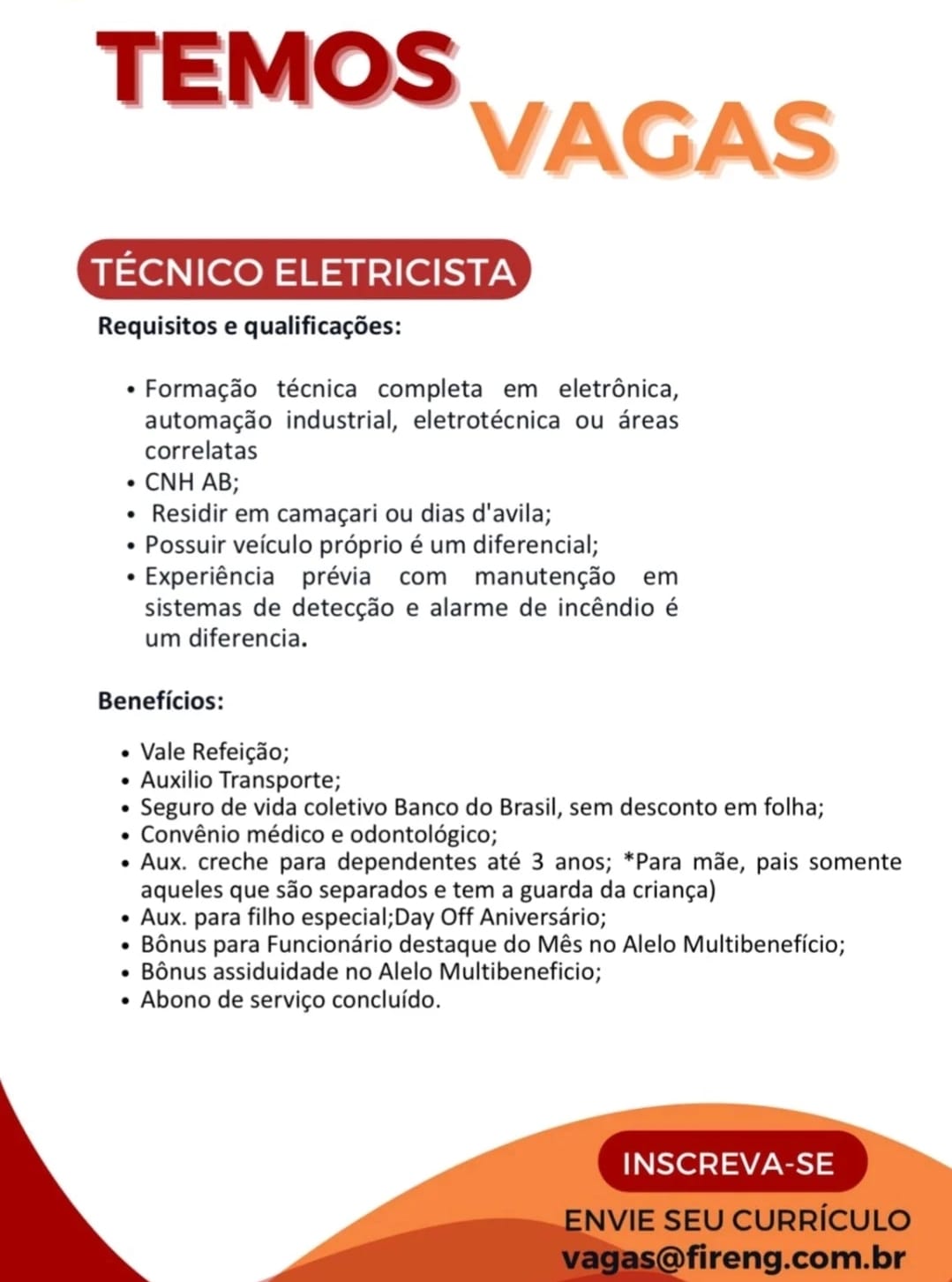 As informações sobre a vaga de emprego, como salário, remuneração, benefícios, requisitos, local de trabalho e forma de candidatura (e-mail ou whatsapp para enviar seu currículo) estarão na imagem abaixo, caso estejam disponíveis.👇