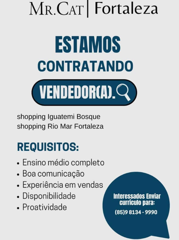 Vaga para Vendedor(a) na Mr. Cat em Fortaleza e Região neste sábado (12/07)